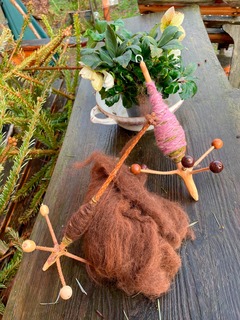 Samstag: Wir schnitzen aus Tannenspitzen die Spindeln, die Wolle wird mit der Kardiermaschine vorbereitet. Nach einer Pause wird die Technik des Handspinnens erlernt, die Wolle verarbeitet, ein Faden gesponnen